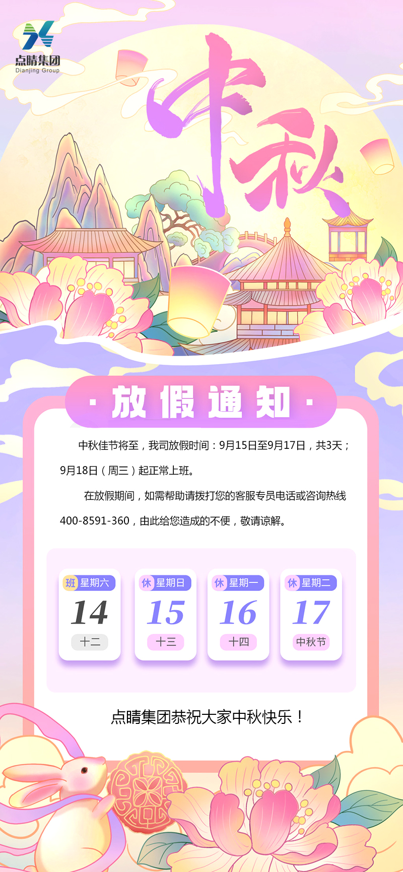 濰坊點(diǎn)睛網(wǎng)絡(luò)科技有限公司攜全體員工祝:中秋節(jié)快樂(lè)!2024-09-14? ? ? 中秋佳節(jié)將至,我司放假時(shí)間:9月15日至9月17日,共3天;9月18日(周三)起正常上班。? ?在放假期間,如需幫助請(qǐng)撥打您的客服專員電話或咨詢熱線400-8591-360,由此...